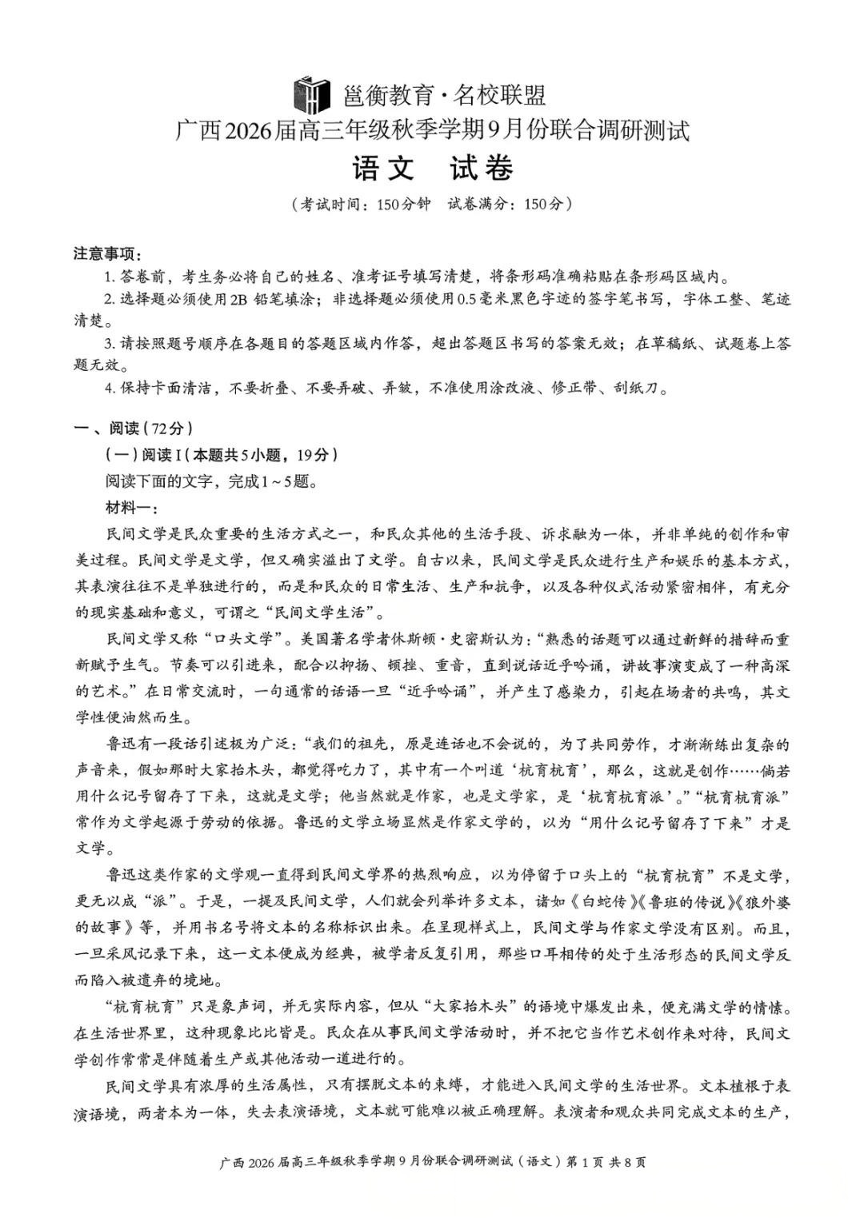 邕衡教育·名校联盟2026届高三年级秋季学期9月份联合调研测试 语文.pdf