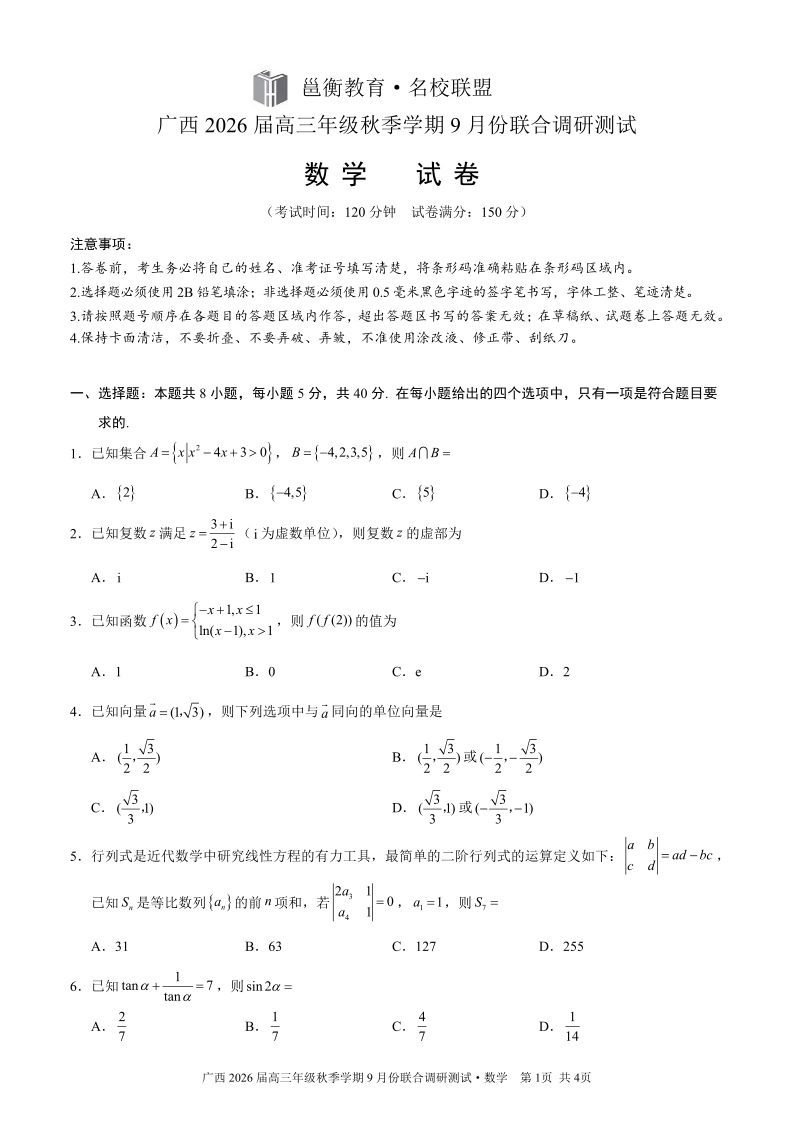 邕衡教育·名校联盟2026届高三年级秋季学期9月份联合调研测试 数学.pdf