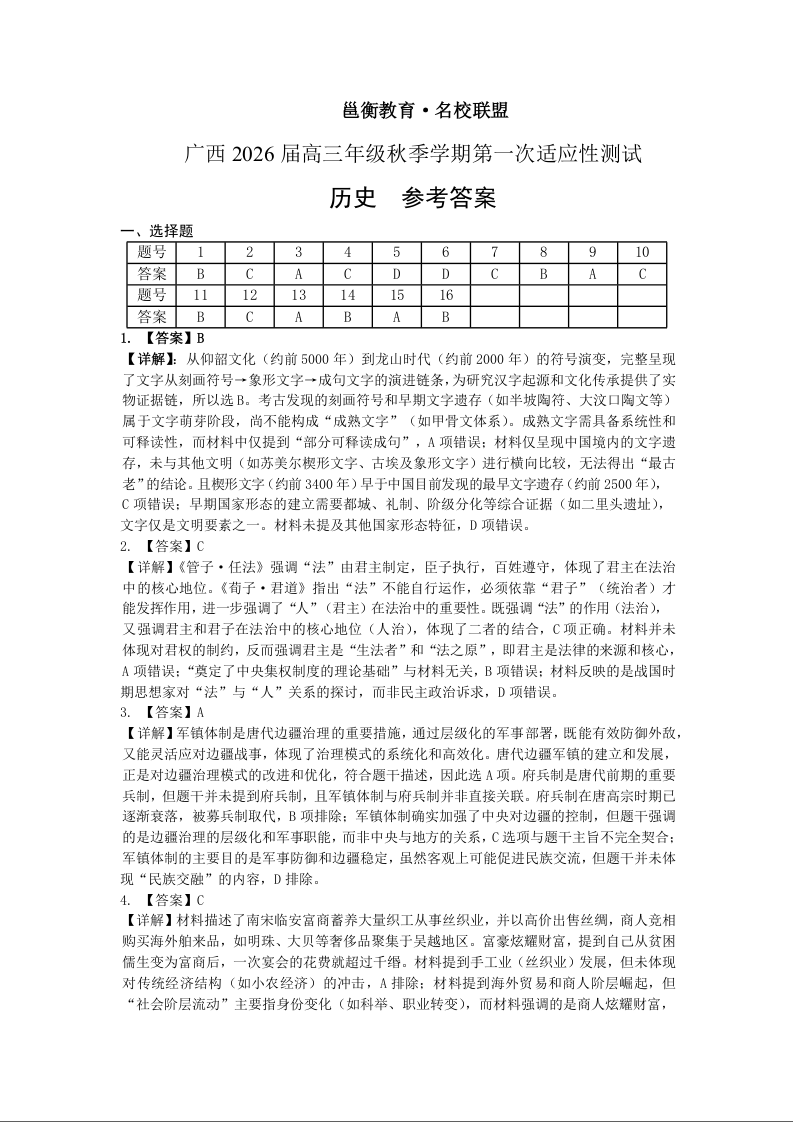 邕衡教育·名校联盟2026届高三年级秋季学期9月份联合调研测试 历史答案.docx