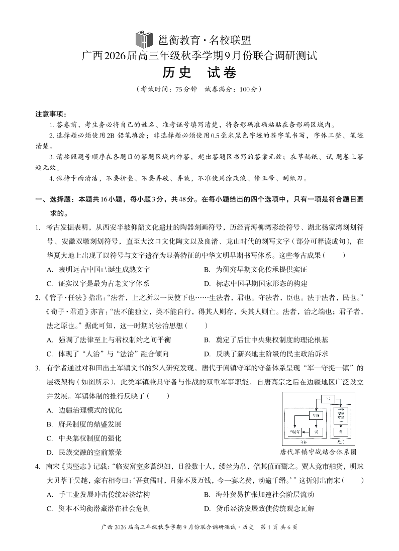 邕衡教育·名校联盟2026届高三年级秋季学期9月份联合调研测试 历史.pdf
