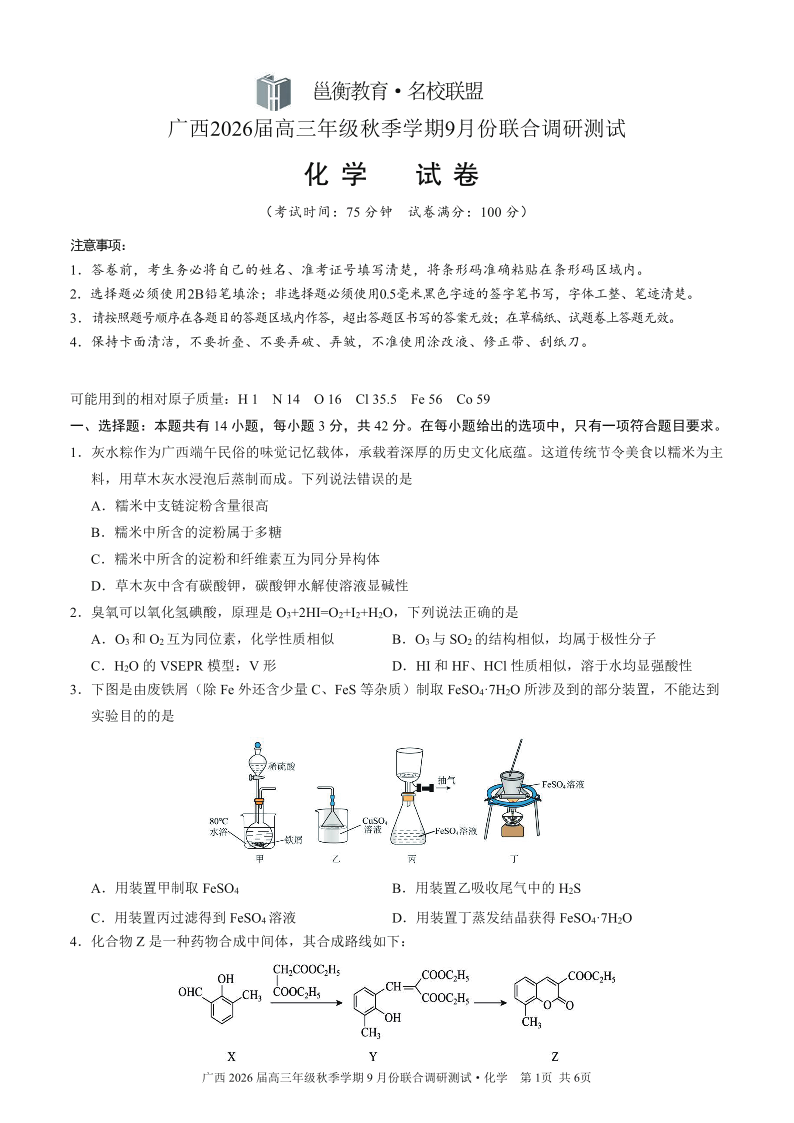 邕衡教育·名校联盟2026届高三年级秋季学期9月份联合调研测试 化学.pdf