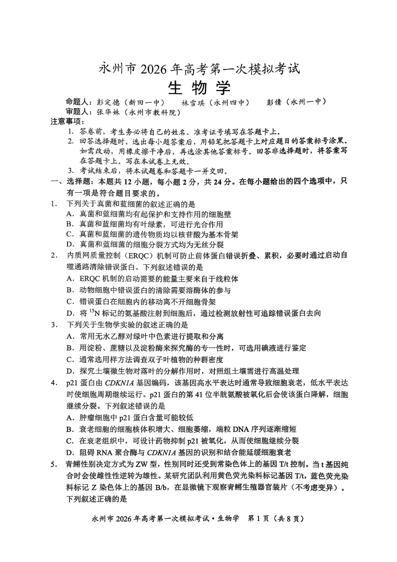 永州市2026年高考第一次模拟考试 生物试卷(含答案).pdf