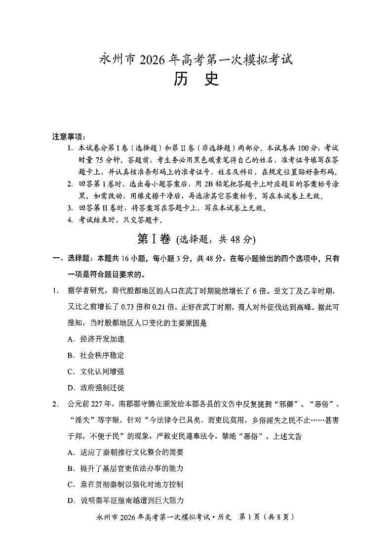 永州市2026年高考第一次模拟考试 历史试卷(含答案).pdf