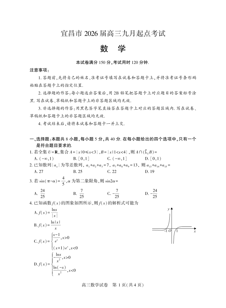 宜昌市2026届高三九月起点考试 数学.pdf