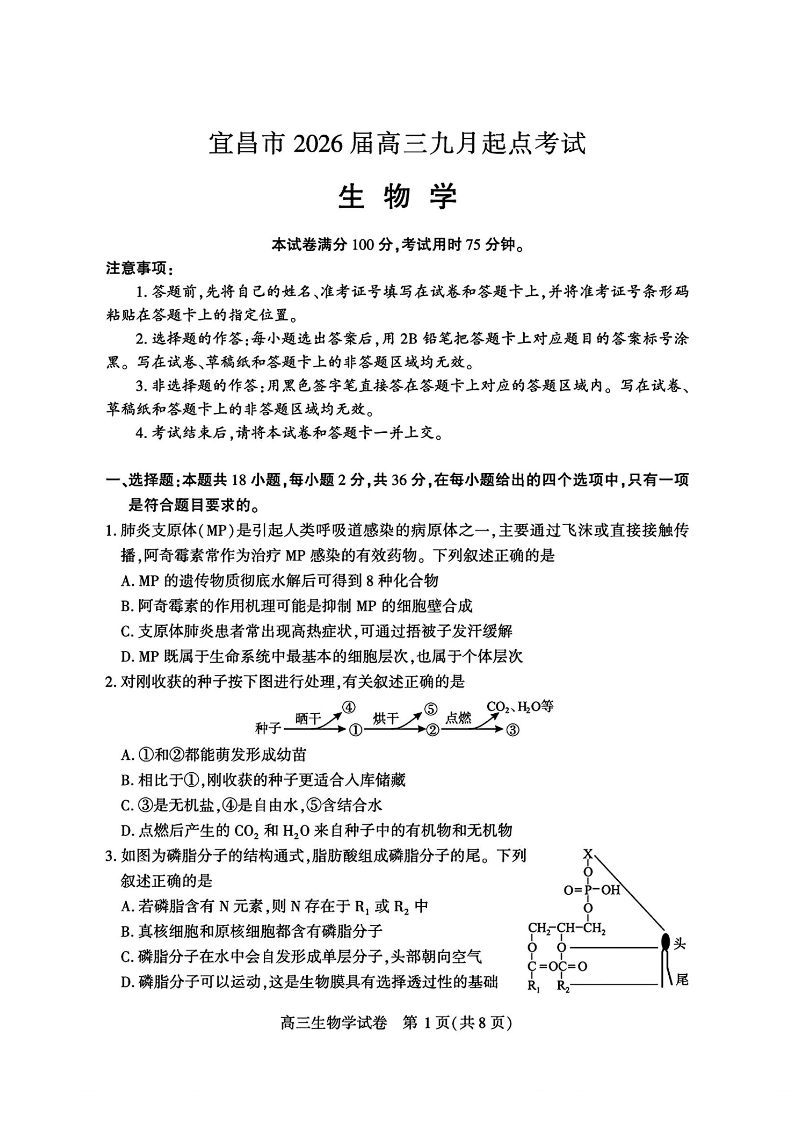 宜昌市2026届高三九月起点考试 生物.pdf