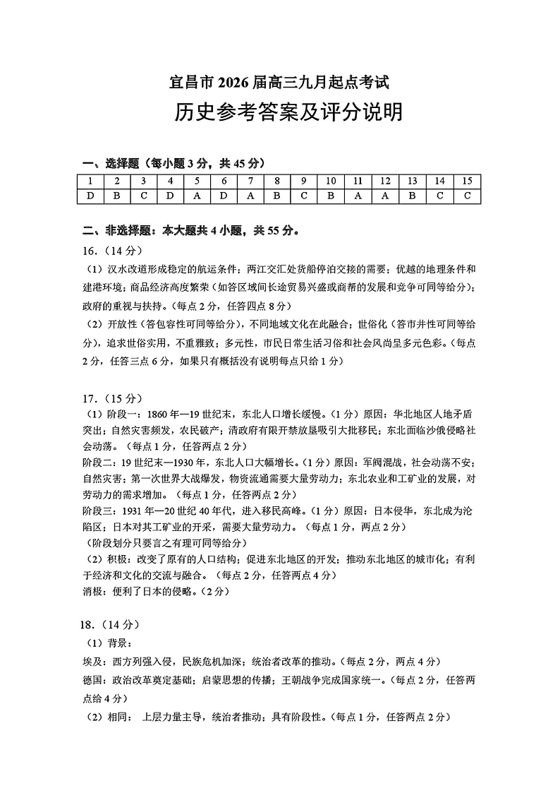 宜昌市2026届高三九月起点考试 历史答案.pdf
