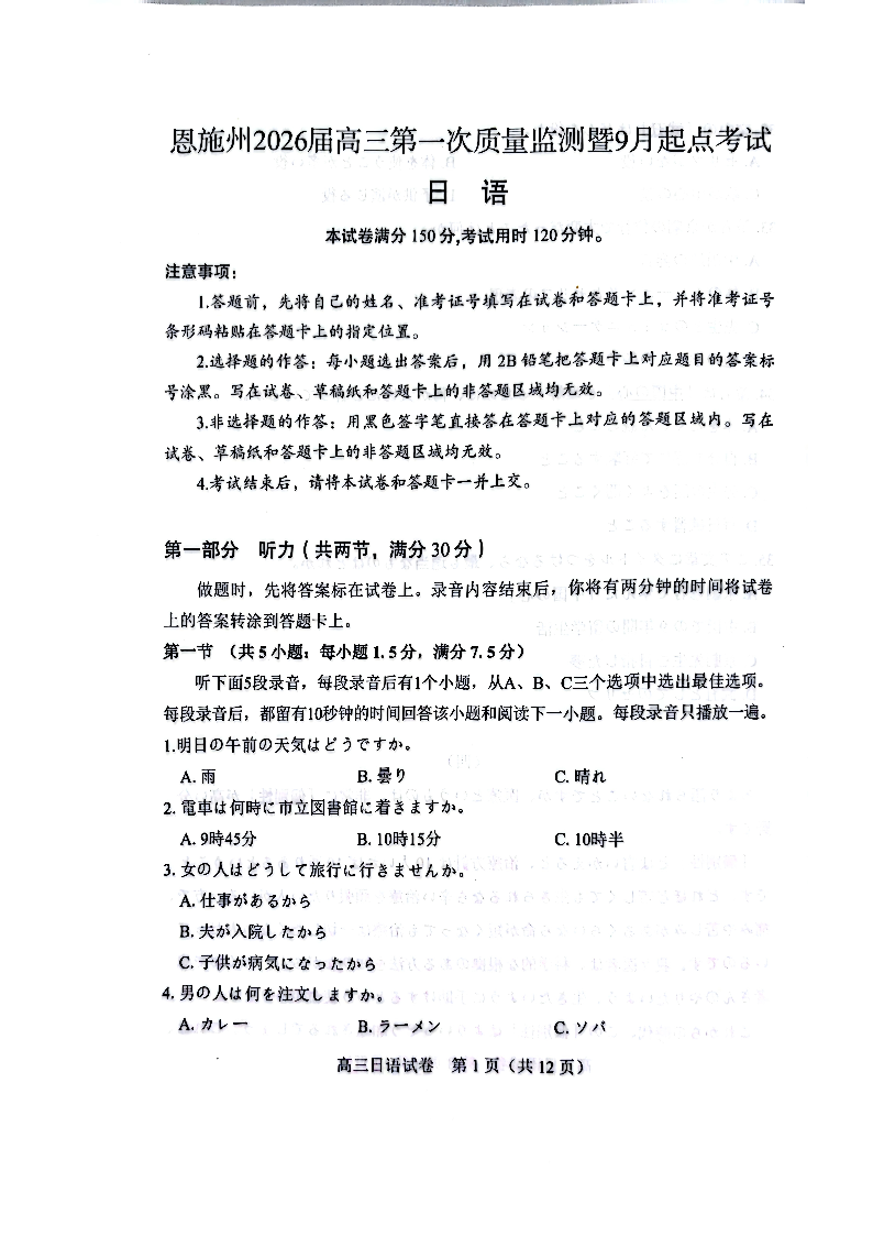 (黄石市,荆门市,鄂州市,咸宁市,恩施州)2026届高三9月起点考试 日语试卷(含答案).pdf