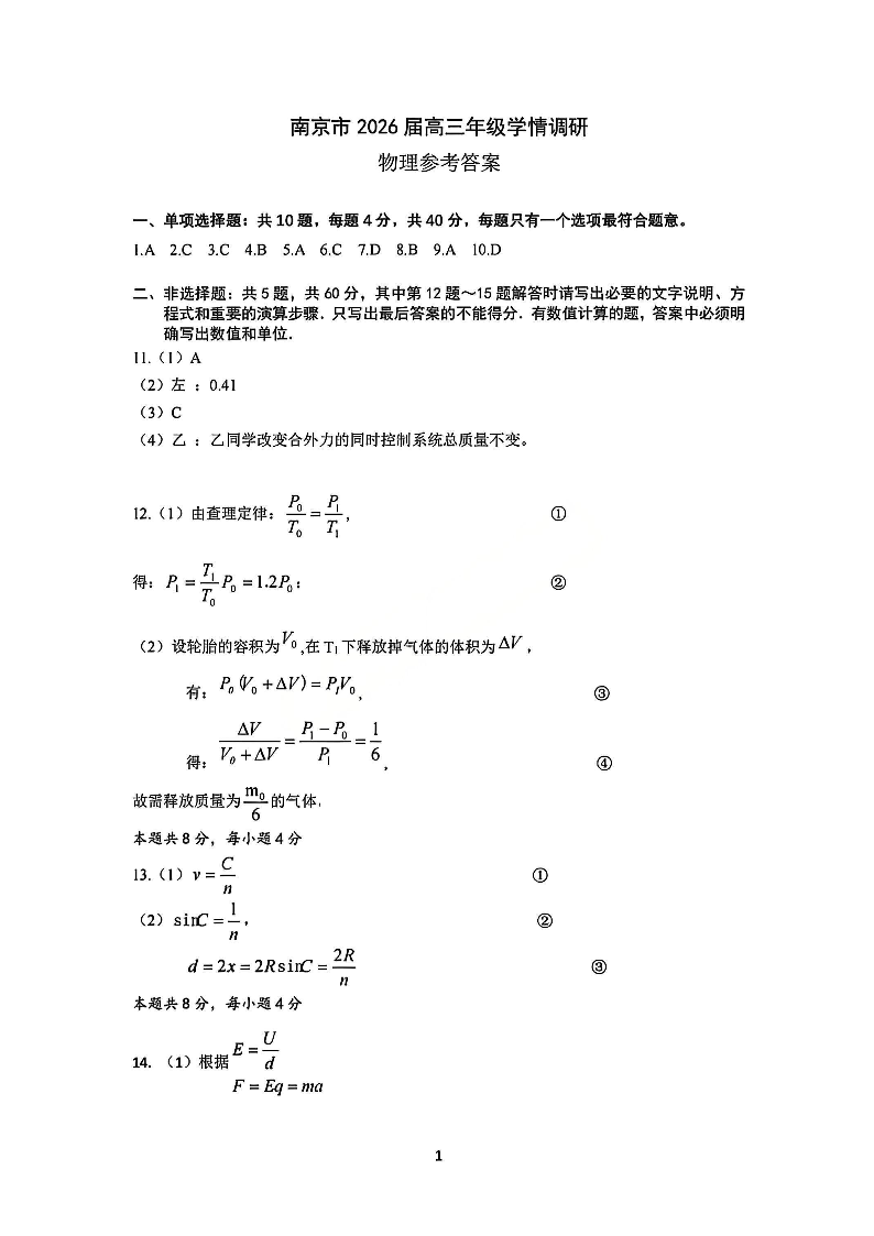 南京市2026届高三年级学情调研 物理答案.pdf