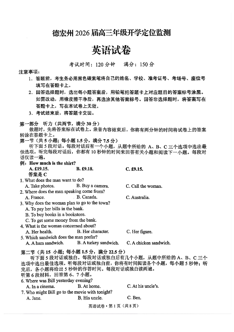 德宏州2026届高三年级开学定位监测 英语.pdf