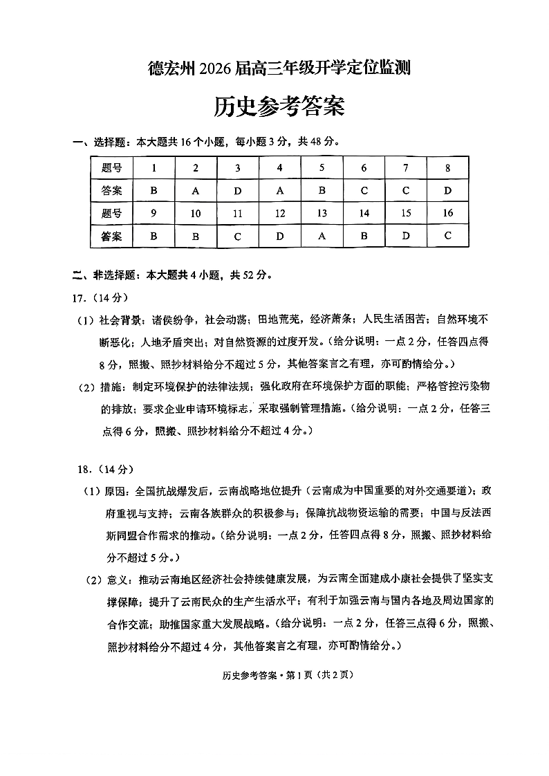 德宏州2026届高三年级开学定位监测 历史答案.pdf