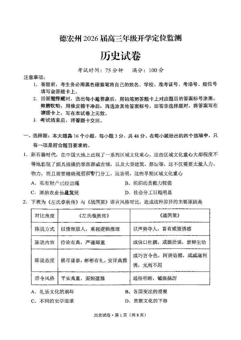 德宏州2026届高三年级开学定位监测 历史.pdf