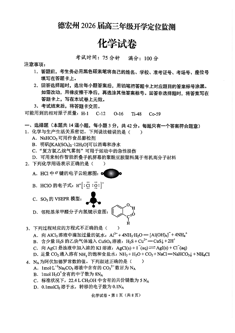 德宏州2026届高三年级开学定位监测 化学.pdf