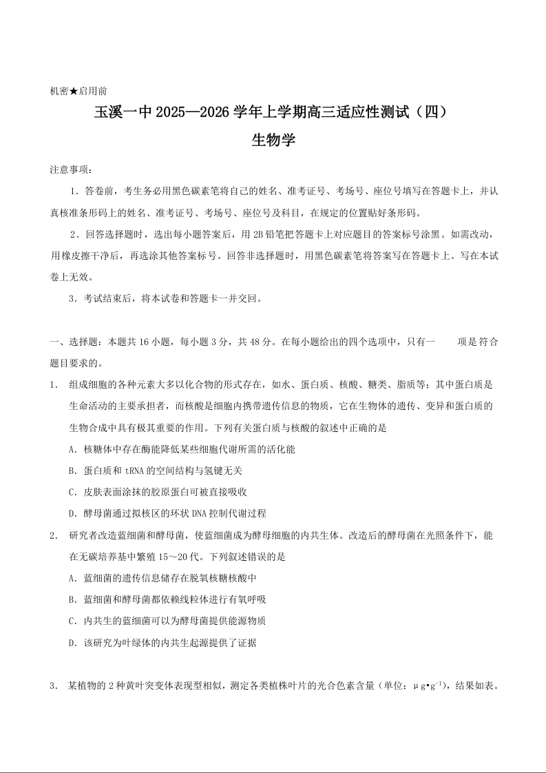 云南省玉溪第一中学2026届高三上学期适应性测试(四)生物试卷(含答案).docx