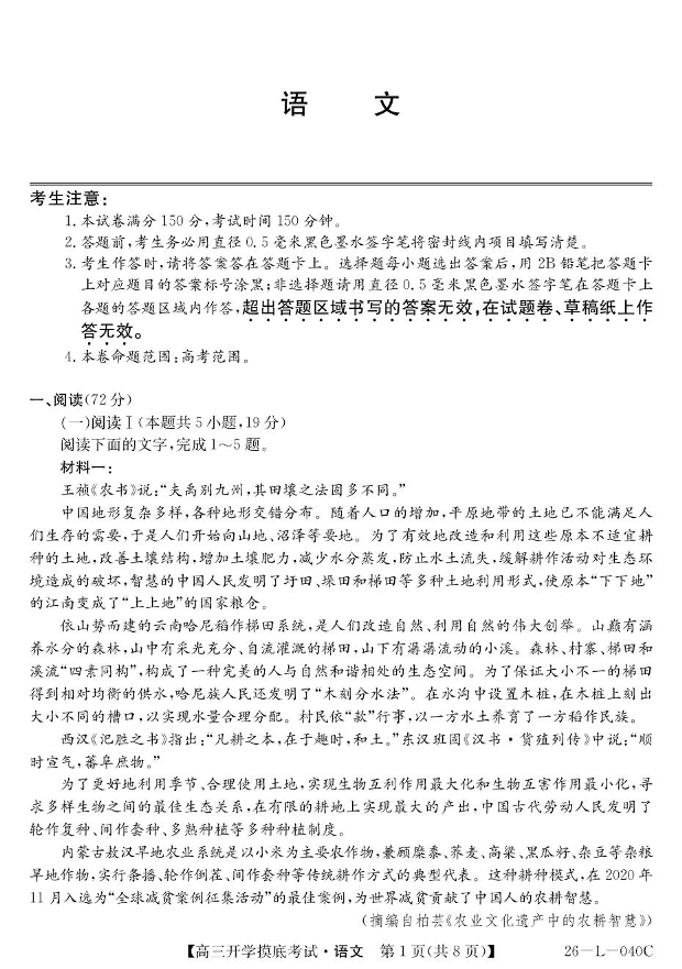 青海省西宁市大通县2026届高三上学期开学摸底考试 语文试题(含答案).pdf