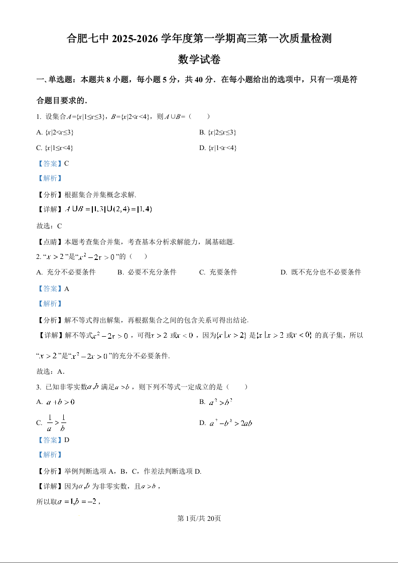 安徽省合肥市第七中学2025-2026学年高三上学期第一次质量检测 数学答案.docx