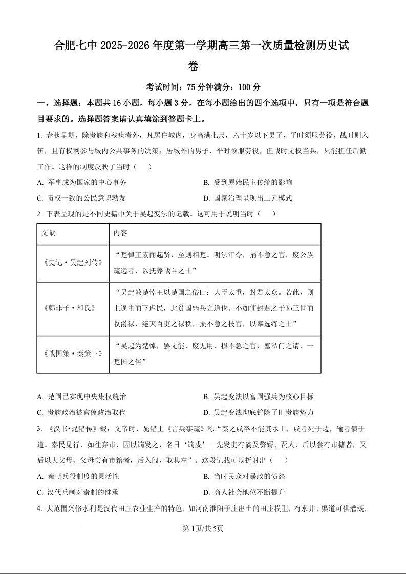 安徽省合肥市第七中学2025-2026学年高三上学期第一次质量检测 历史.docx
