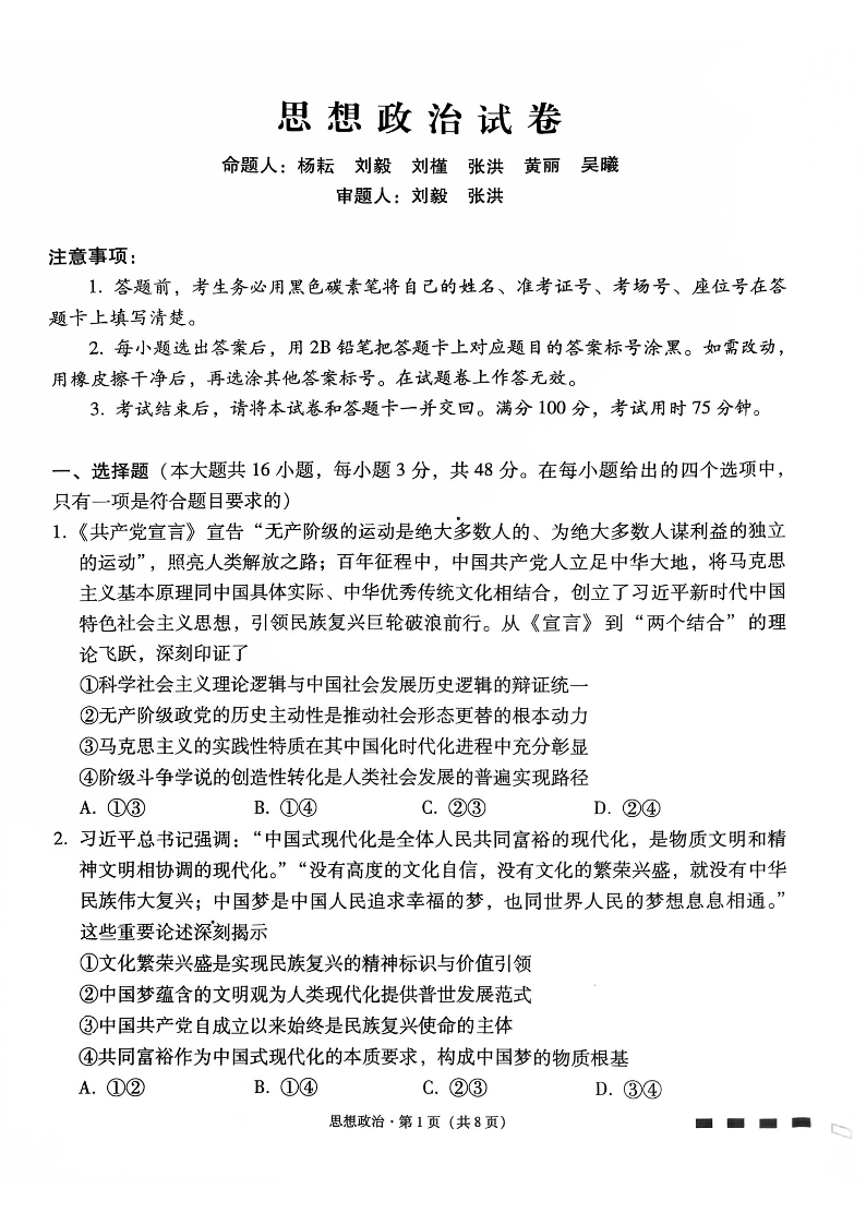 贵阳市第一中学2026届高考适应性月考卷(一)政治.pdf