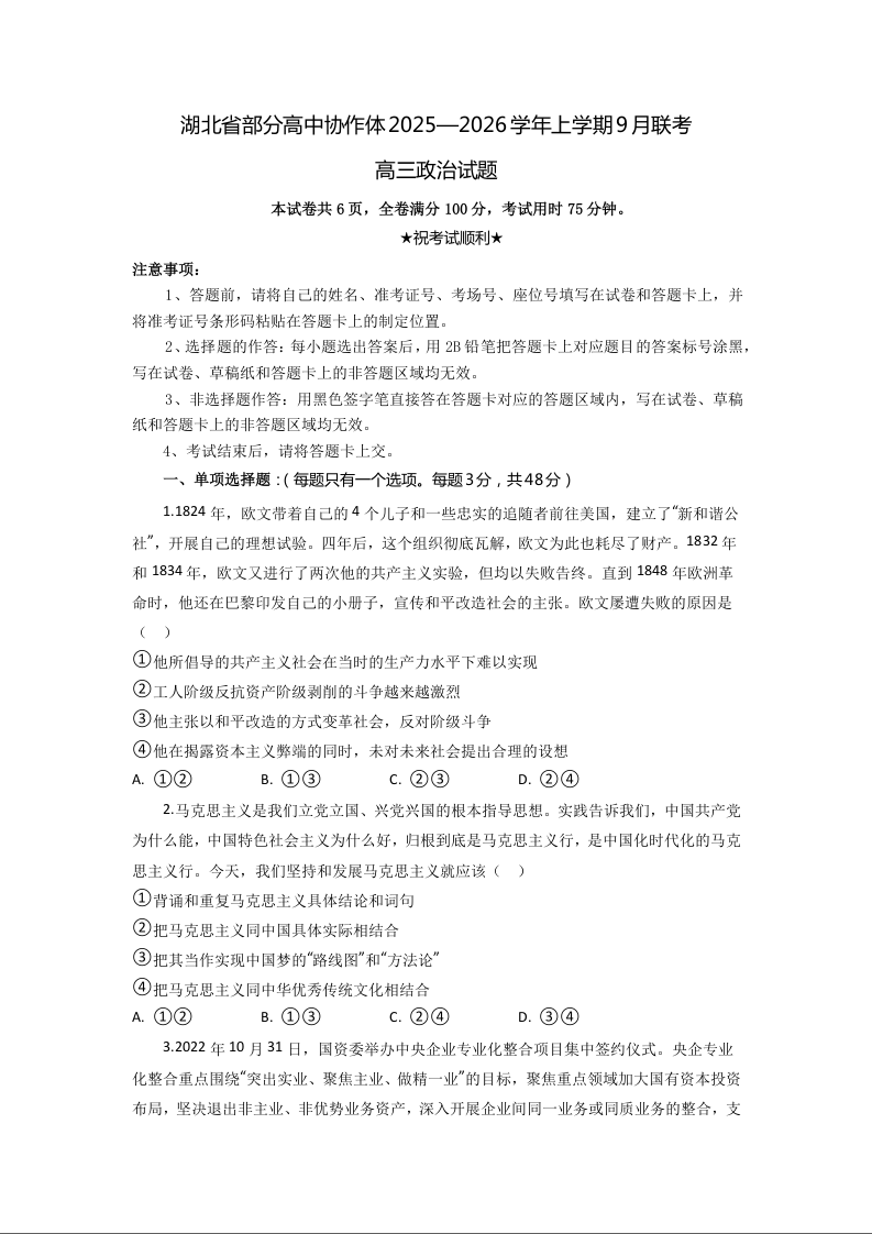 湖北省部分高中协作体2025-2026学年高三上学期9月联考 政治.docx
