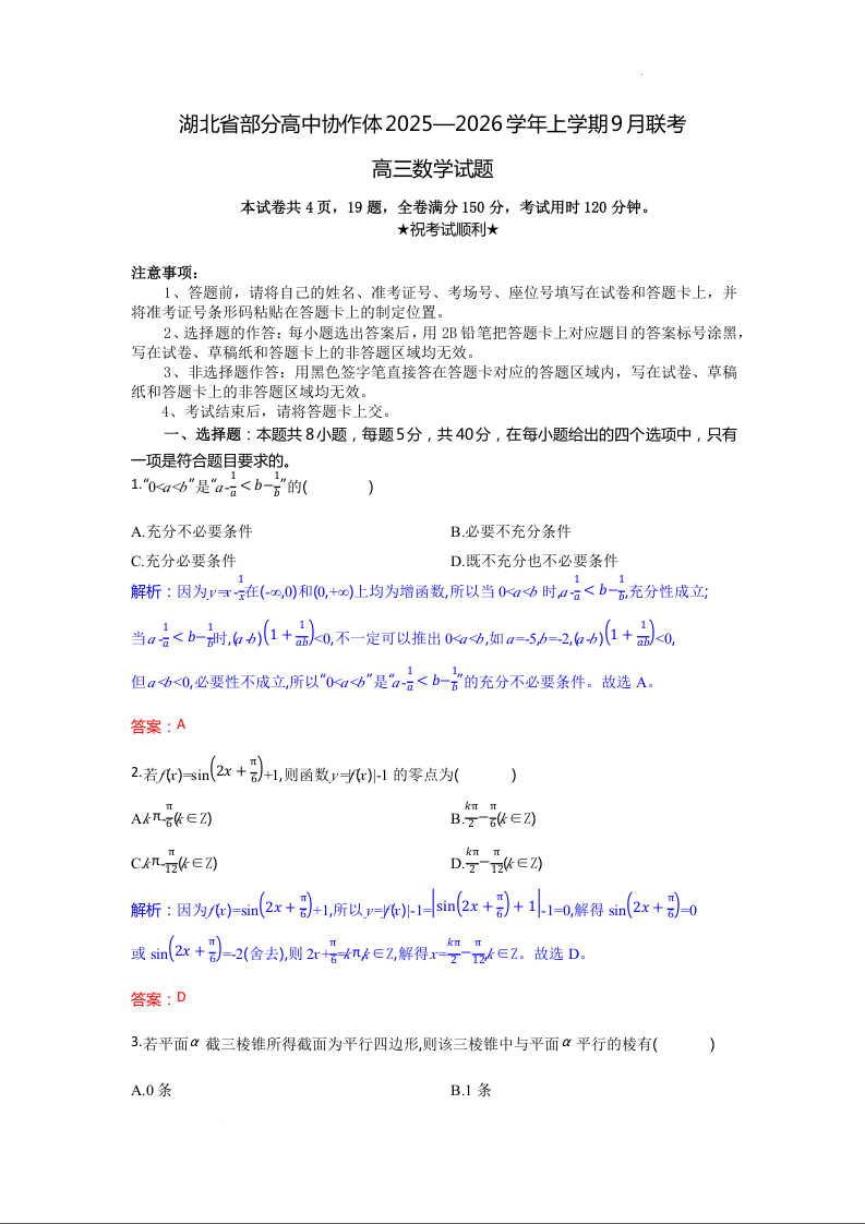 湖北省部分高中协作体2025-2026学年高三上学期9月联考 数学解析.docx