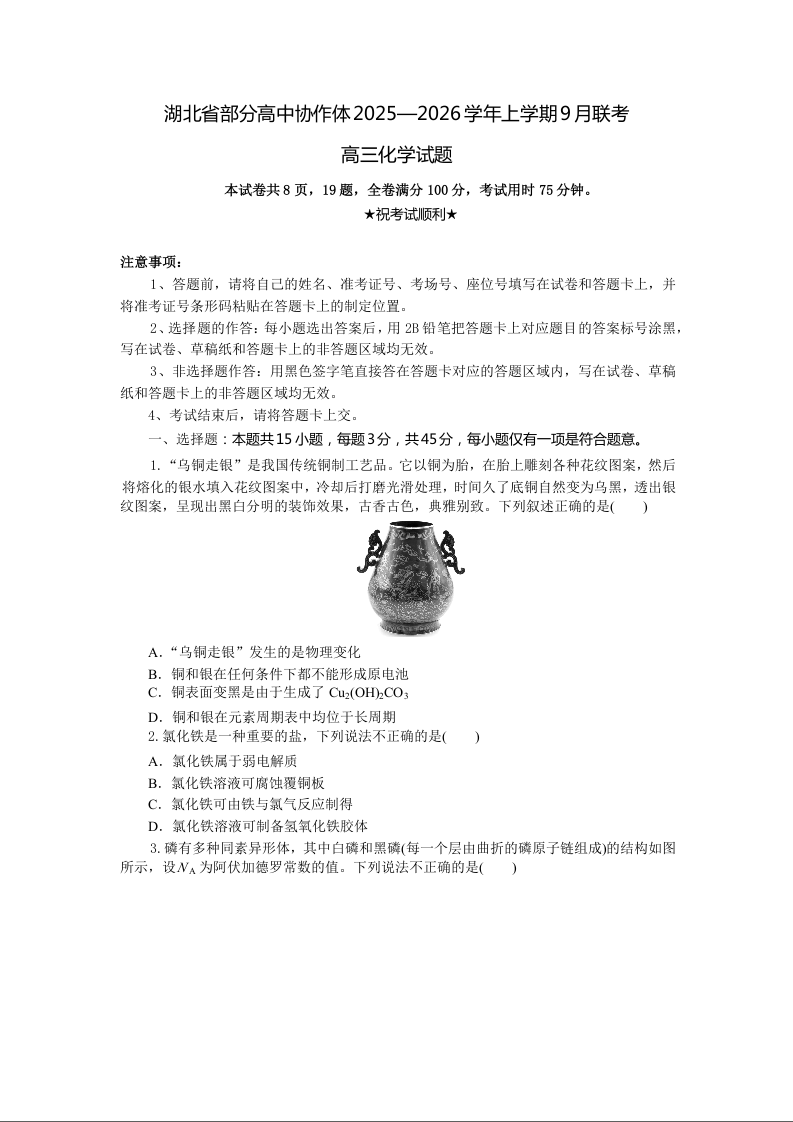 湖北省部分高中协作体2025-2026学年高三上学期9月联考 化学.docx