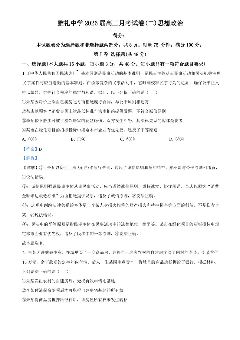 炎德·英才大联考雅礼中学2026届高三月考试卷(二)政治答案.docx