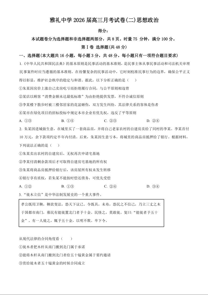 炎德·英才大联考雅礼中学2026届高三月考试卷(二)政治.docx