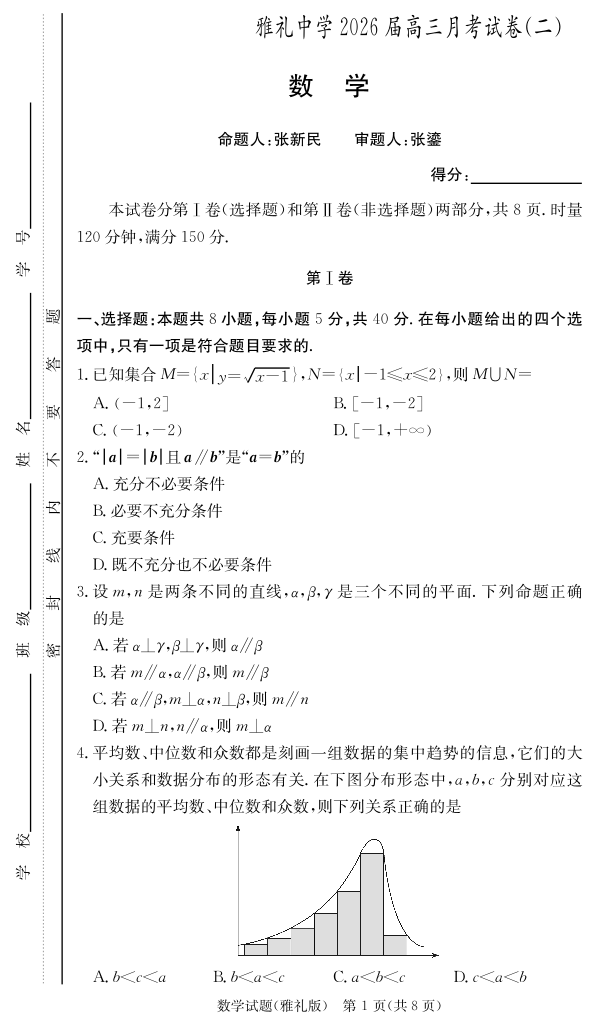 炎德·英才大联考雅礼中学2026届高三月考试卷(二)数学.pdf