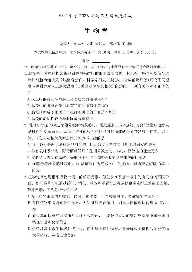 炎德·英才大联考雅礼中学2026届高三月考试卷(二)生物.docx