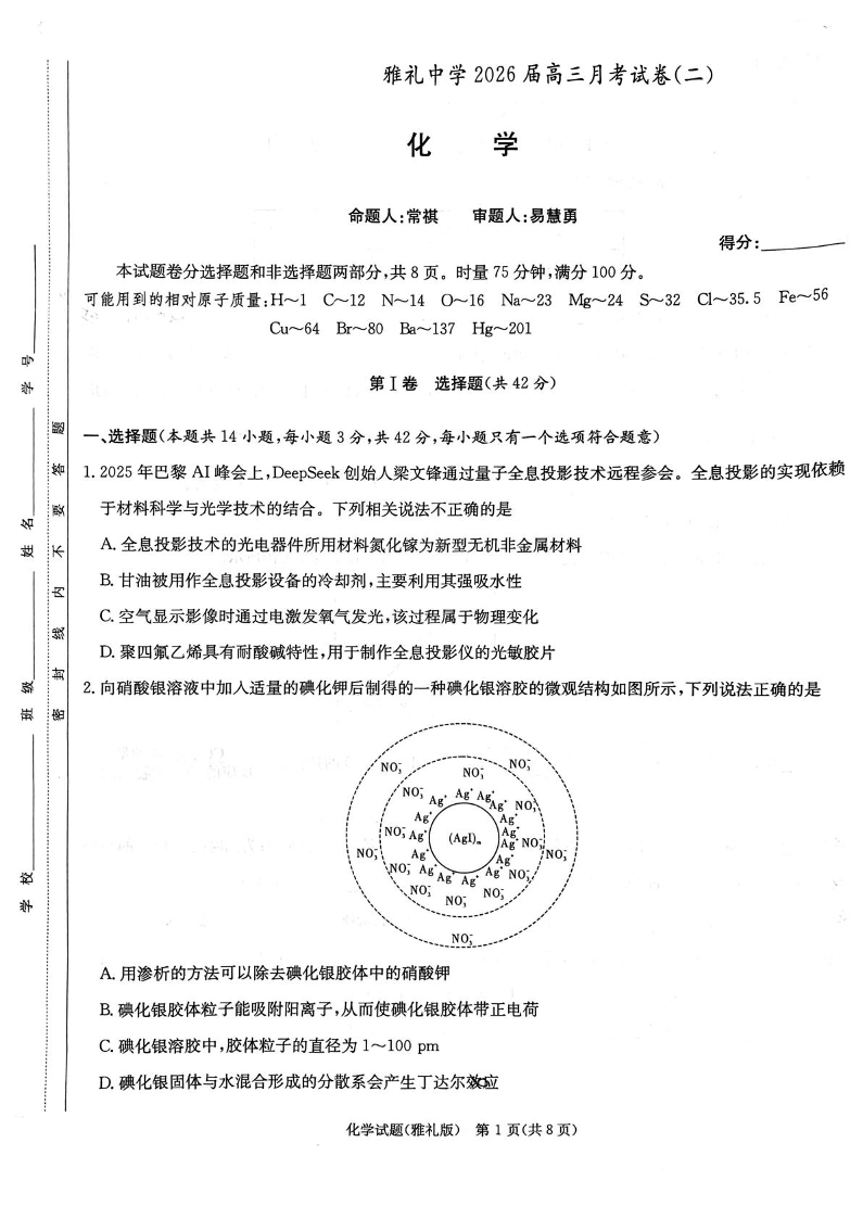 炎德·英才大联考雅礼中学2026届高三月考试卷(二)化学.pdf