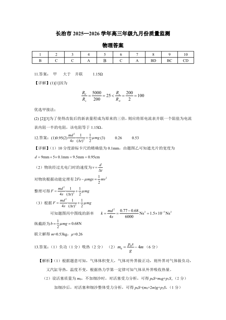 长治市2025-2026学年度高三年级九月份质量监测 物理答案.pdf