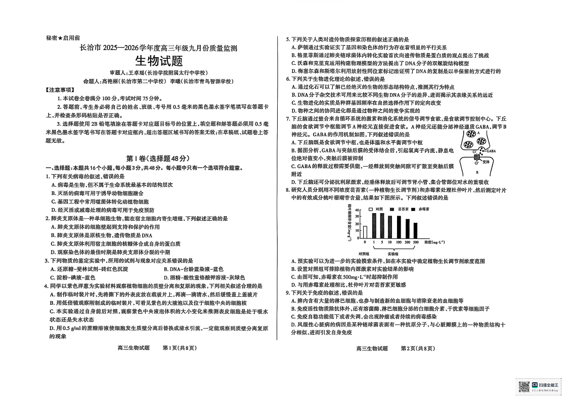 长治市2025-2026学年度高三年级九月份质量监测 生物.pdf
