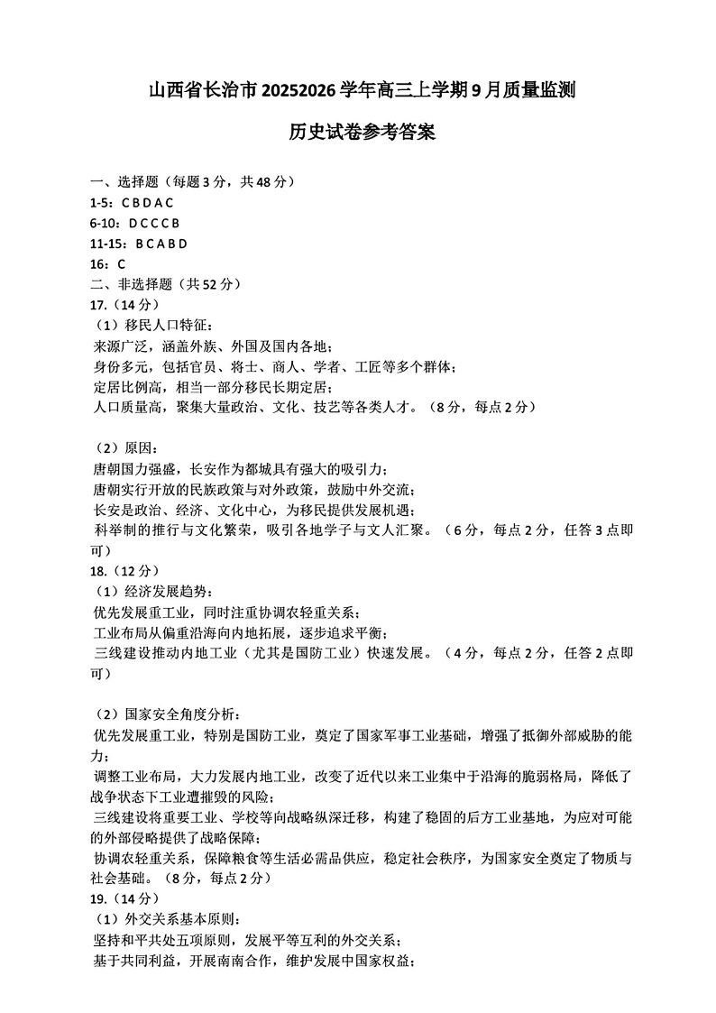 长治市2025-2026学年度高三年级九月份质量监测 历史答案.pdf