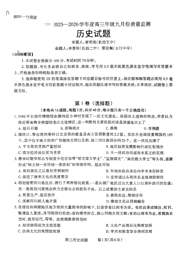 长治市2025-2026学年度高三年级九月份质量监测 历史.pdf