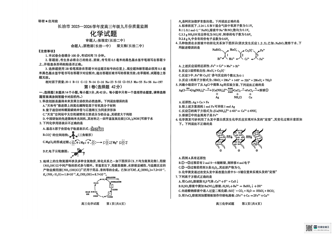 长治市2025-2026学年度高三年级九月份质量监测 化学.pdf