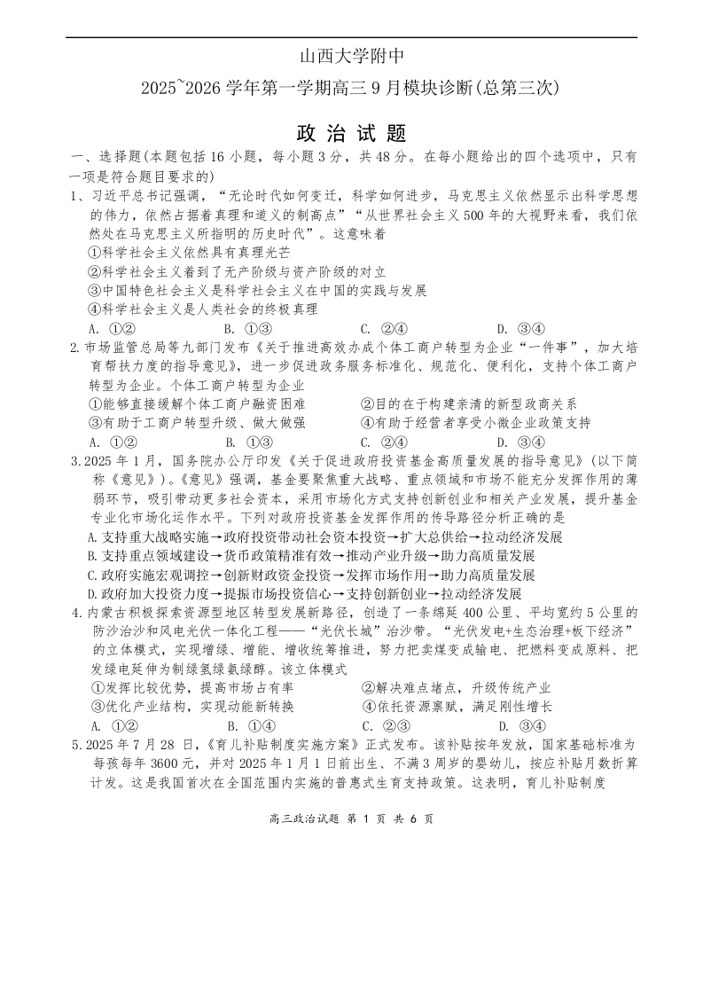 山西大学附中2025-2026学年高三上学期9月(总第三次)模块诊断 政治.docx