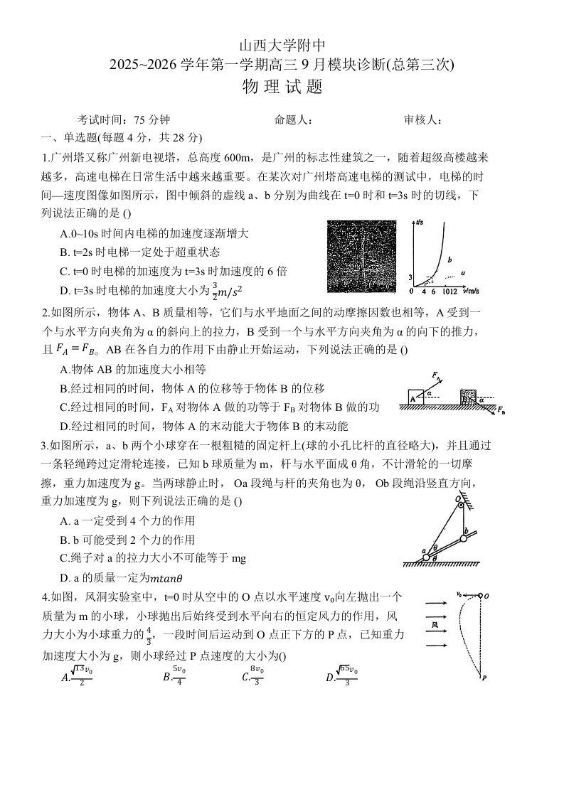 山西大学附中2025-2026学年高三上学期9月(总第三次)模块诊断 物理.docx