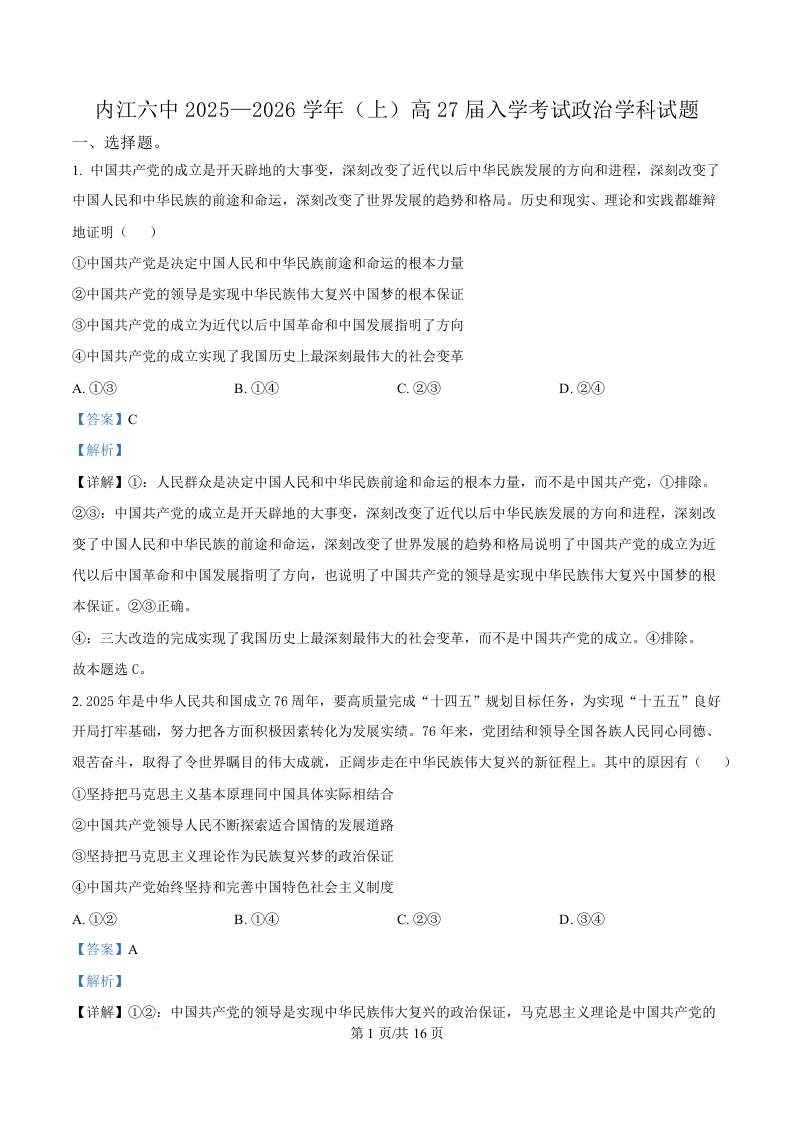 四川省内江市第六中学2025-2026学年高二上学期入学检测 政治答案.docx
