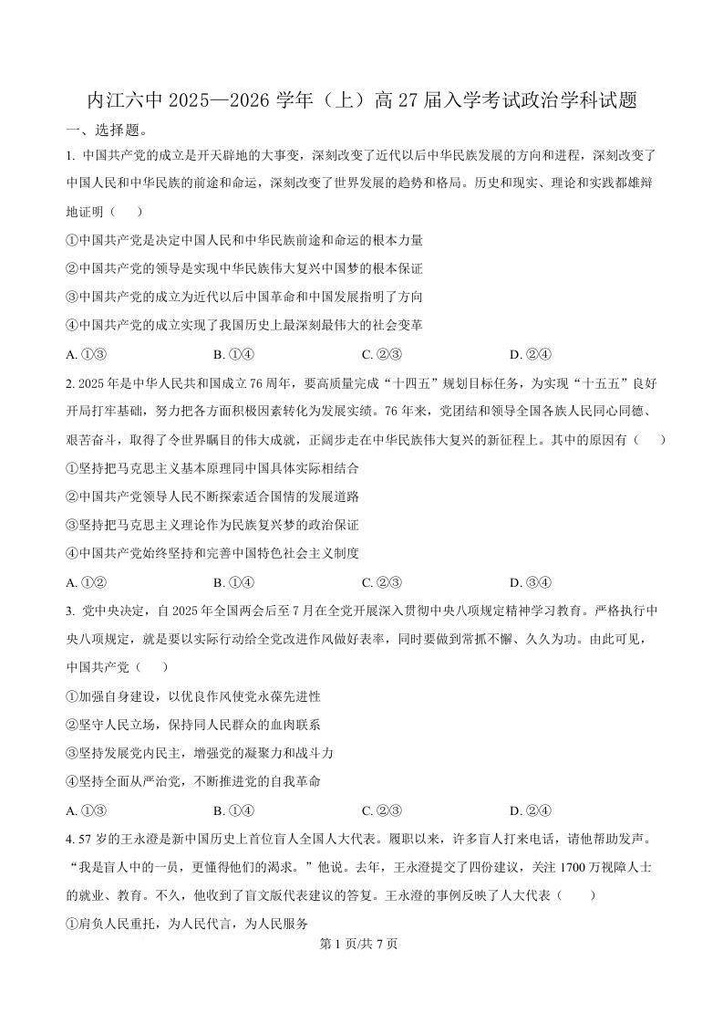 四川省内江市第六中学2025-2026学年高二上学期入学检测 政治.docx