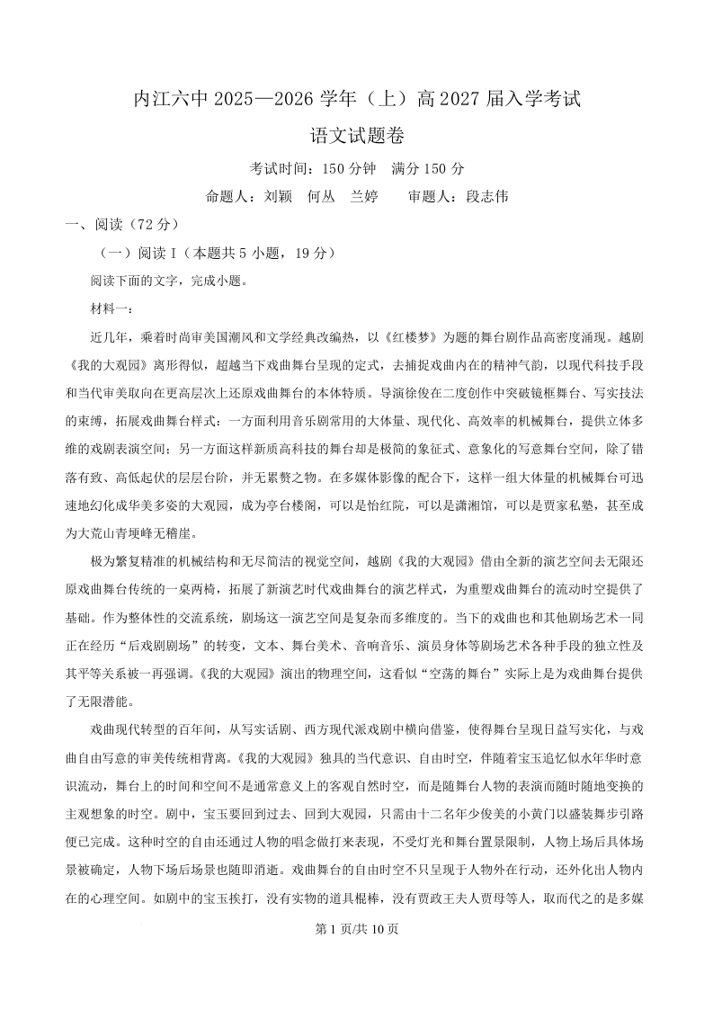 四川省内江市第六中学2025-2026学年高二上学期入学检测 语文.docx