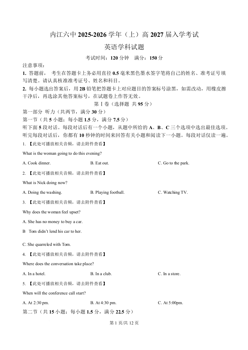 四川省内江市第六中学2025-2026学年高二上学期入学检测 英语.docx