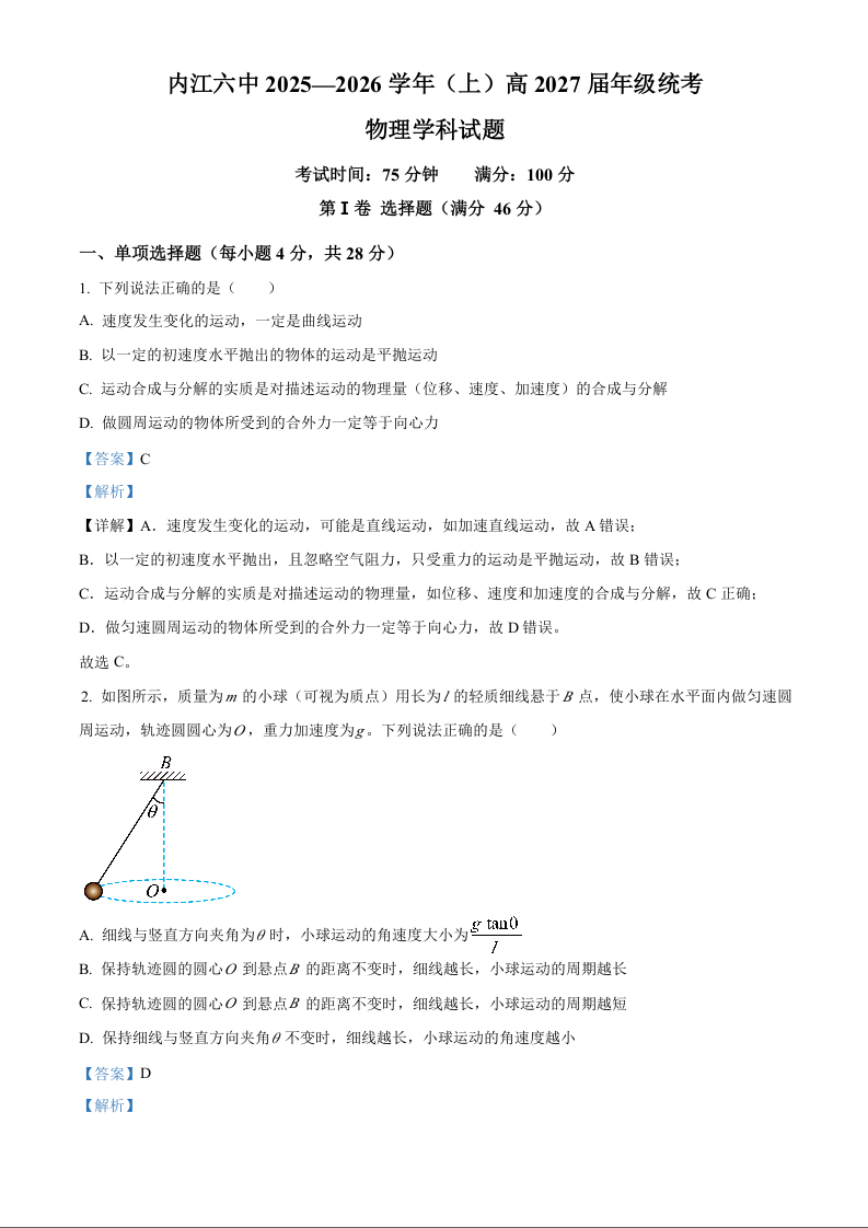 四川省内江市第六中学2025-2026学年高二上学期入学检测 物理答案.docx