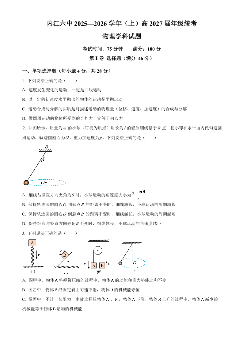 四川省内江市第六中学2025-2026学年高二上学期入学检测 物理.docx