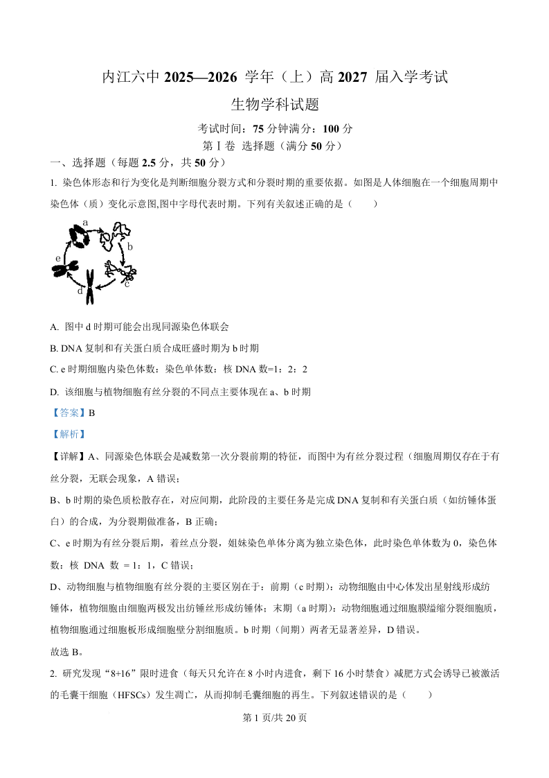 四川省内江市第六中学2025-2026学年高二上学期入学检测 生物答案.docx