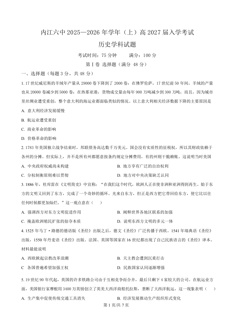 四川省内江市第六中学2025-2026学年高二上学期入学检测 历史.docx
