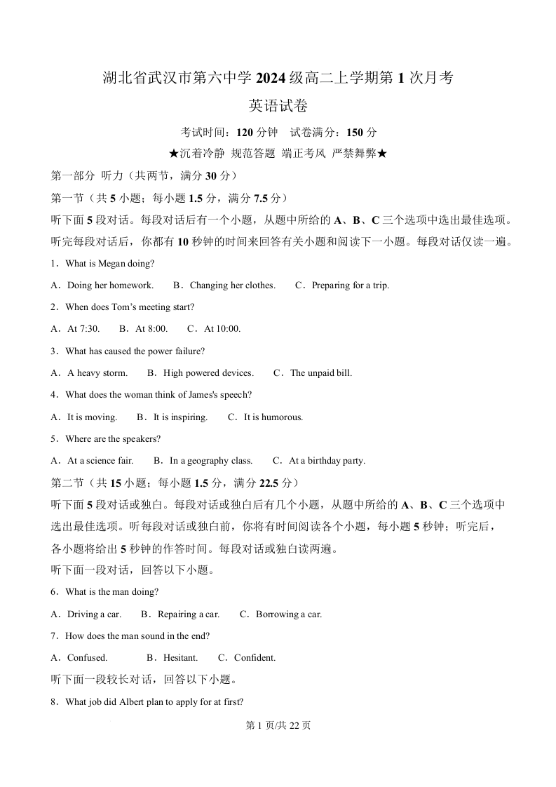 武汉市六中2025-2026学年高二上学期第一次月考 英语答案.docx