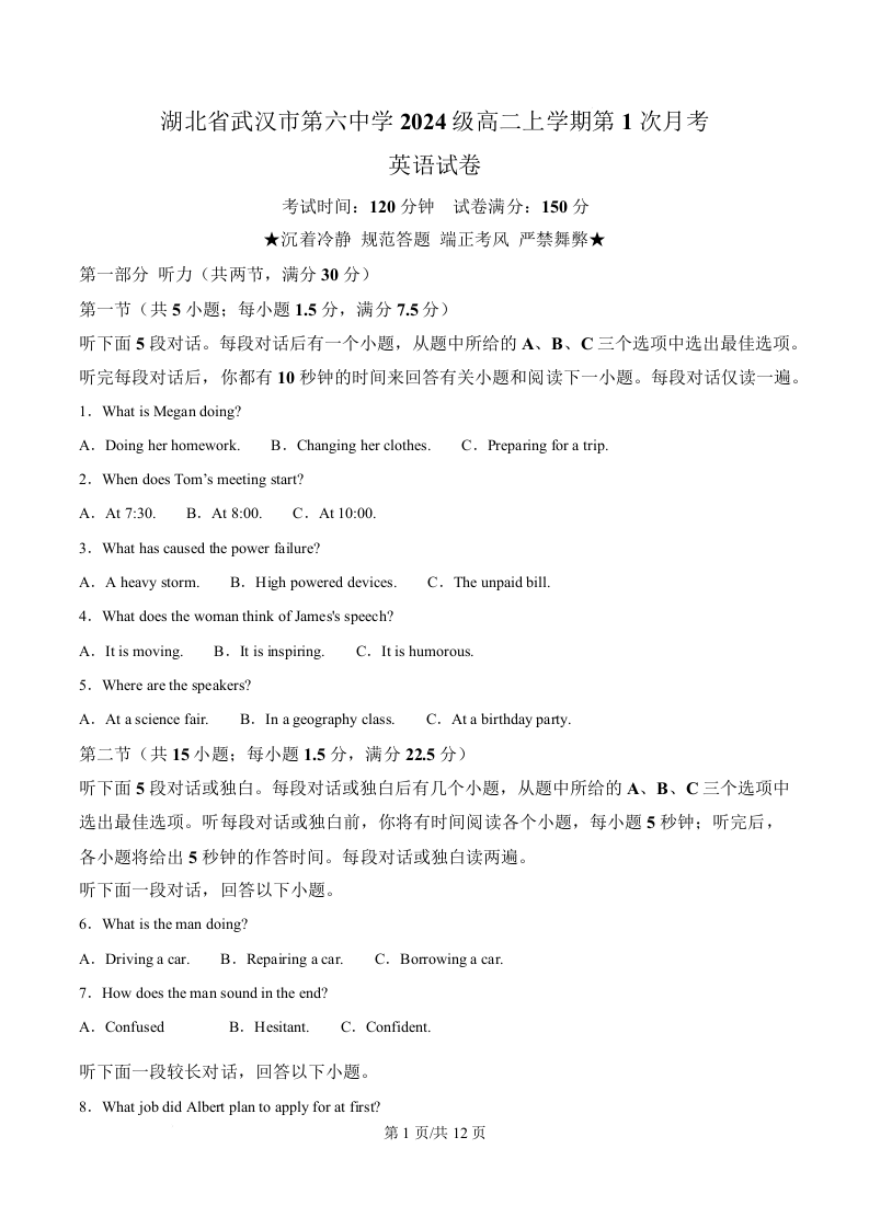 武汉市六中2025-2026学年高二上学期第一次月考 英语.docx