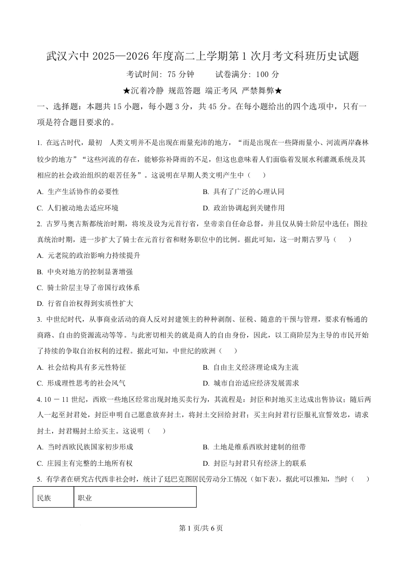 武汉市六中2025-2026学年高二上学期第一次月考 历史.docx