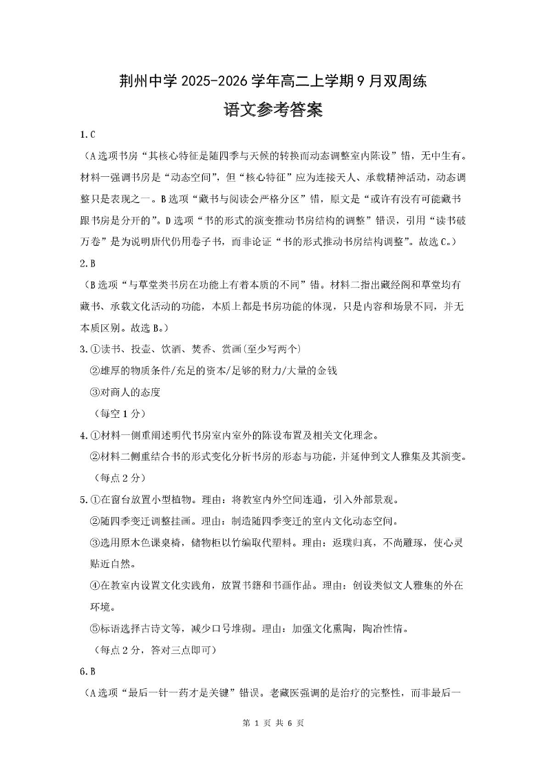 湖北省荆州中学2025-2026学年高二上学期9月双周练(月考)语文答案.pdf