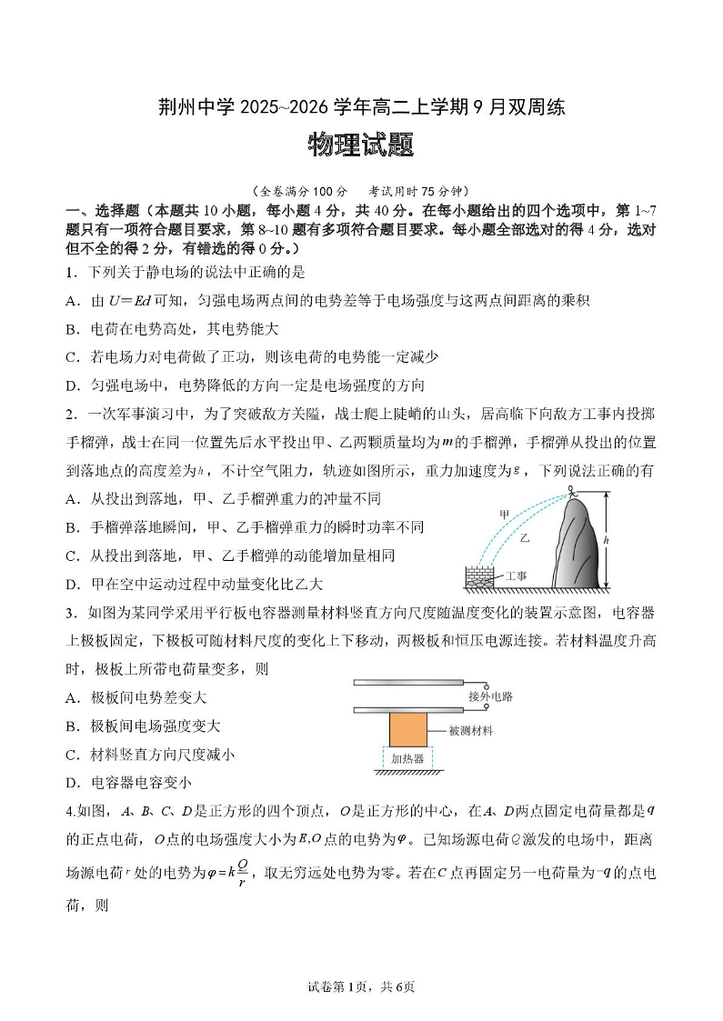 湖北省荆州中学2025-2026学年高二上学期9月双周练(月考)物理.pdf