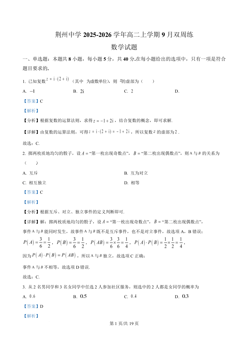 湖北省荆州中学2025-2026学年高二上学期9月双周练(月考)数学答案.docx